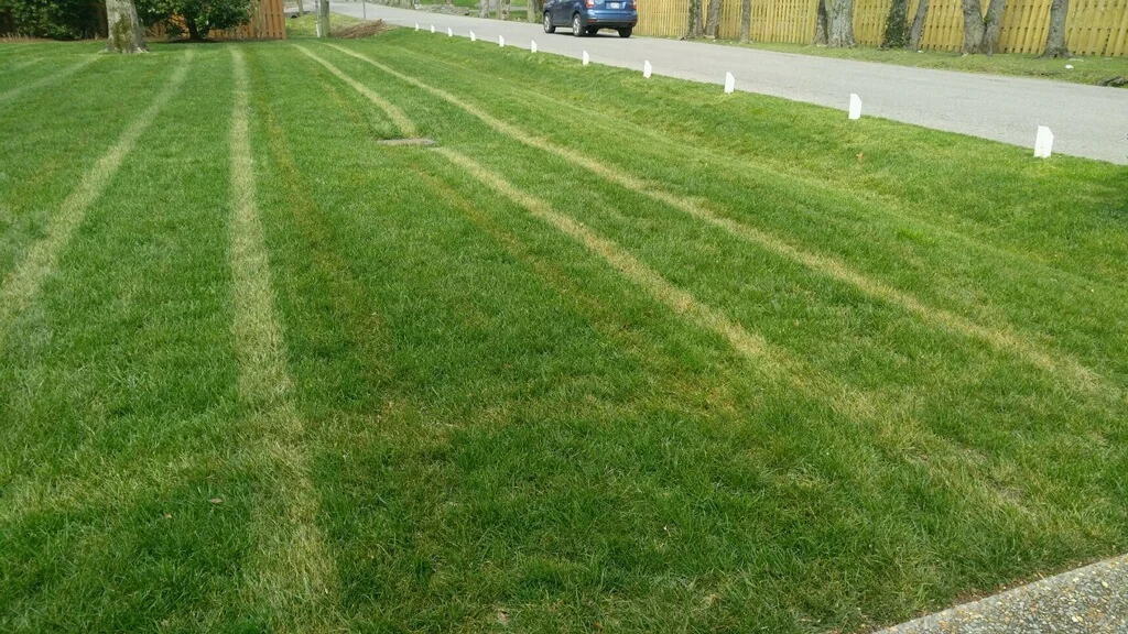 These aren't photos of my work — these are lawns that customers brought me after something went wrong. A company sprayed at the wrong rate, or in the wrong temperature window, or with a machine that wasn't calibrated, and the homeowner is the one paying for it. I'm showing these because if your lawn looks like any of the photos on this page, it's not a mystery disease — someone put the wrong chemistry on the grass, and you can see the evidence. The two photos showing tire-track patterns are the giveaway. When a fertilizer or herbicide cakes up on the tires of an applicator and then drops off in concentrated amounts as the tires rotate, you get sharp stripes of dead grass exactly as wide as the tire. That's over-application, not disease. A properly calibrated Stinger Gateway applicator — which is what I run — cleans itself as it moves and applies at the labeled rate. Cheap push spreaders and broken ride-on units with clogged hoppers don't do that. They dump. The other common cause I see is homeowners who unknowingly exceed the annual 2,4-D limit. Practically every combo herbicide at a big-box store contains 2,4-D. The label allows two blanket applications per year, at least thirty days apart. Homeowners apply a weed-and-feed in spring, then spot-spray with a liquid product in summer that also contains 2,4-D, and they've already doubled their legal annual count without knowing it. The lawn goes yellow, the grass thins out, and they wonder what happened. Temperature is the other big one. Ester-based herbicides are more effective on tough weeds like Virginia buttonweed and wild violet than amine-based formulations — but esters are volatile. Above roughly 80 degrees, the chemistry becomes unstable enough to damage fescue even when the active ingredient is supposed to be selective for broadleaves. That's why the most effective products for summer weeds cannot be used in the summer. You have to hit those weeds in spring or fall. If somebody sprayed your lawn in July for nutsedge and it yellowed the fescue around it, that was ester volatility, not the nutsedge fighting back. There's also a safety issue homeowners rarely hear about: morning dew re-suspends 2,4-D on grass blades, which means it becomes dislodgeable again. Morning samples show five to ten times more dislodgeable residue than afternoon samples, and it persists for at least six days after application. It comes off on shoes, bare feet, pet paws, and children walking to the school bus. That's one of the reasons I care about calibration and labeled rates — not just to avoid burning the grass, but to avoid leaving residue that shouldn't be there. If you're seeing damage like this, the fix is usually to stop treating, water thoroughly to dilute what's on the surface, and wait. Fescue that's only top-killed can recover in three to six weeks with proper fertilization. Fescue that was hit hard enough to kill the crown needs to be overseeded in fall. I do free evaluations for customers who were burned by another company — bring me a photo, I'll tell you what I think happened and whether it can recover.